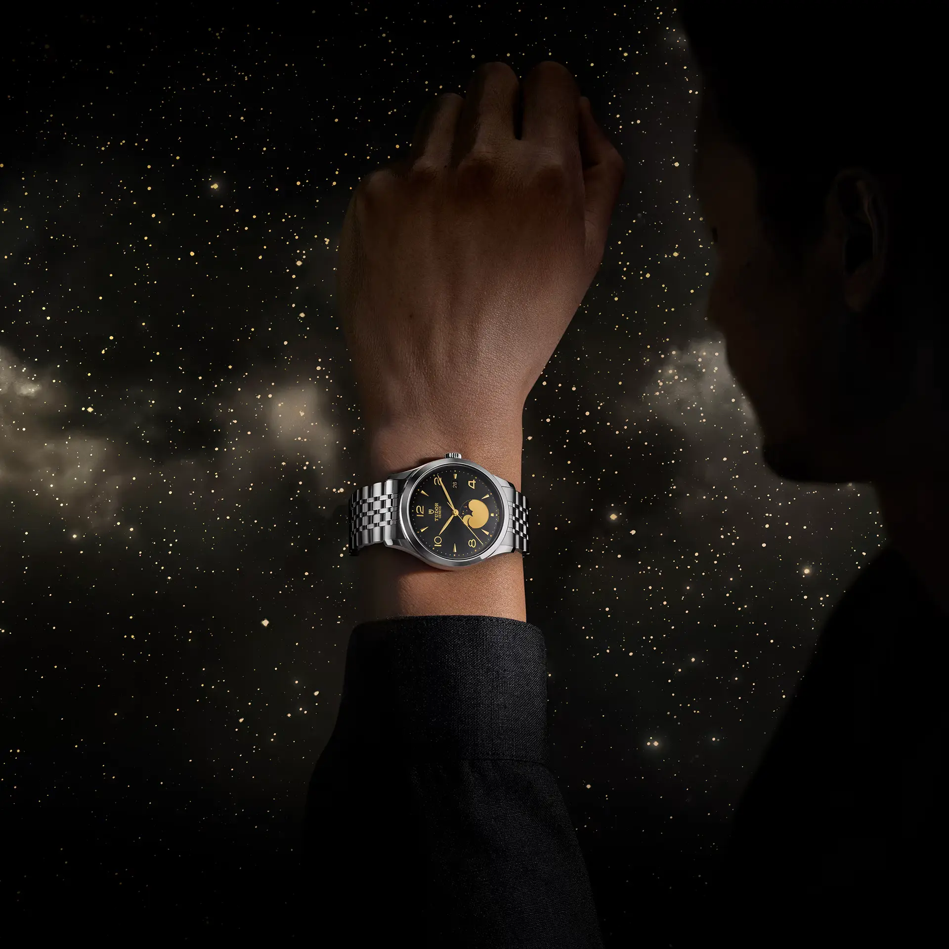 DialBlack satin sun-brushed dial with applied numerals and moon phase indicator